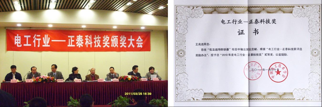 2011年3月25日,2010年度“電工行業(yè)——正泰科技獎”頒獎大會在北京中國科技會堂舉行。我公司董事長、總經(jīng)理王兆連以其率領(lǐng)團(tuán)隊在研發(fā)超導(dǎo)除鐵器上的貢獻(xiàn)獲此殊榮。