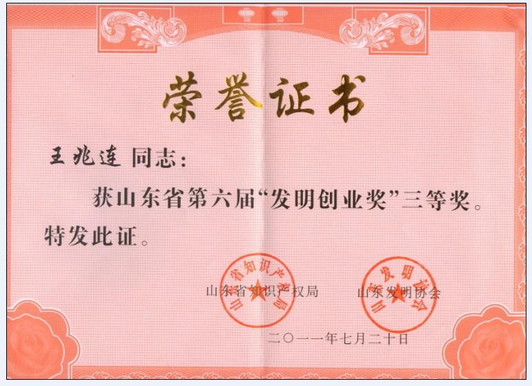 日前,由省知識產權局、山東發明協會組織評選的山東省第六屆“發明創業獎”評選揭曉,公司董事長兼總經理王兆連獲三等獎。
