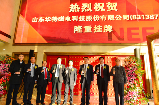 公司董事長王兆連先生在賀詞中指出:“實業(yè)+科技+資本”是我們始終堅持的發(fā)展模式,今天華特磁電成功登陸全國性資本市場,這是公司發(fā)展歷程中的一個重要里程碑,也是一個新起點、新動力。我們將牢牢緊抓這一寶貴機遇,一如既往,繼續(xù)努力,通過不斷提升優(yōu)勢產品的持續(xù)開發(fā)和創(chuàng)新升級能力,不斷開拓新市場,確保實現(xiàn)業(yè)績快速增長,為華特磁電下一步進軍創(chuàng)業(yè)板市場打下良好的基礎,和兄弟企業(yè)在中國資本市場攜手共進,為振興臨朐經濟做出更大貢獻。