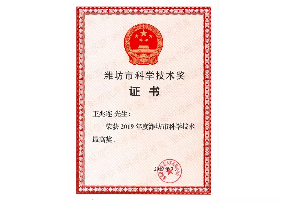 近日,濰坊市科學技術獎勵委員會辦公室公布了2019年度濰坊市科學技術獎授獎項目人選,華特磁電董事長王兆連被授予2019年度濰坊市科學技術最高獎。